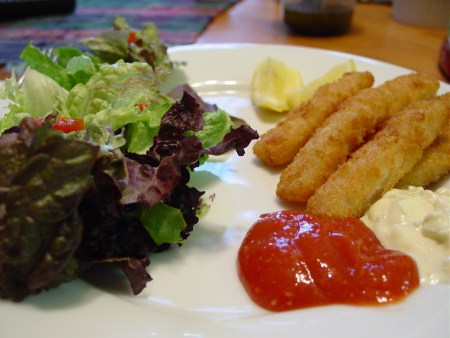 These fish sticks are almost as visually striking as they are tasty. Black and white sesame seeds make the outer crust for the fish. A teriyaki dipping sauce completes this rather elegant meal.