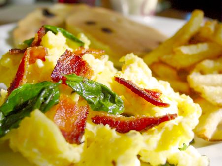 This is one of those meals that breathes fresh life into all of us. Both kids are a little sick – nothing major, but enough to make them rather crabby. Our boy is at the age that he insists on sitting at the table – despite a bloody lip yesterday that would suggest he’s not quite ready. There was quite a bit of tension about, but after this meal everything seems better. We introduce cream cheese scrambled eggs tonight in addition to our usual breakfast fare.