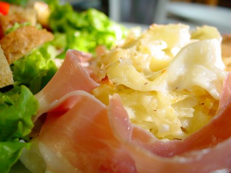 We might have made a little too much fettucine alfredo the other night. We froze a portion of it and after defrosting it in the microwave, we bake it with some grated romano on top. The cheese gives the dish a thin crust. Together with some prosciutto, it makes a completely new meal from leftovers.