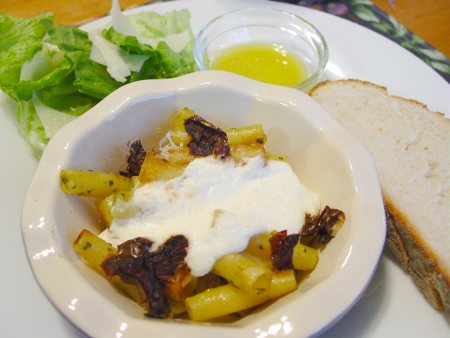 We had this meal planned as soon as we had Wednesday’s meal planned. We made sure to have plenty of pasta leftover from that meal to serve as the base for tonight. Baking the pasta (and adding ricotta) keeps the meal fresh. Plus we enjoy a new salad tonight – with a garlic lemon parmesan dressing!