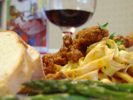 We’re not sure what qualifies as romantic in other families, but this is it in ours: homemade fettuccine with a tomato sausage sauce, roasted asparagus, and slices of italian bread. Why is this romantic? Well, there are many reasons…