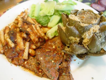 Chris abstained from his weekly half price burger for tonight’s meal. It was more than worth it. The preparation was relatively easy since the cavatelli and tomato sauce are both leftover from last night. We add some thin steak to the sauce to make it a little different. We also add some stuffed artichokes to appease our daughter, who has come to love them.