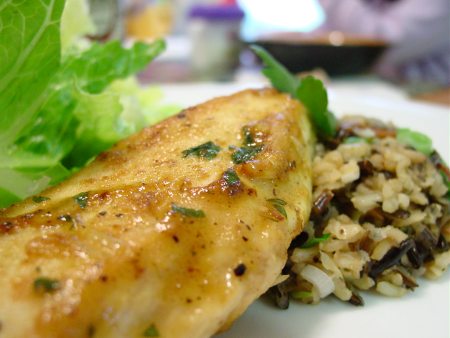 We’ve done the lemon chicken thing before, tonight we go with orange chicken. Fresh orange juice serves as inspiration for this simple yet delicious dish. We still have some leftover wild rice from a previous chicken meal, so we re-heat that tonight and toss in some chopped scallions for some crunch.
