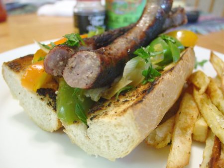 It’s days like today that make Chris realize that he is the luckiest human male on the face of the Earth. After watching football all afternoon, we have sausage and pepper sandwiches for dinner. And not just any sausage sandwiches, but the best sausage and pepper sandwiches ever.