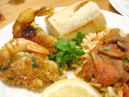 Back in the day, Sarah would make a weekly dinnertime visit. Job and child have necessitated that those visits could not continue, but tonight we get a visit from both Sarah and Olivia. We serve fusilli with a mushroom sauce and some fried shrimp to mark the occasion.