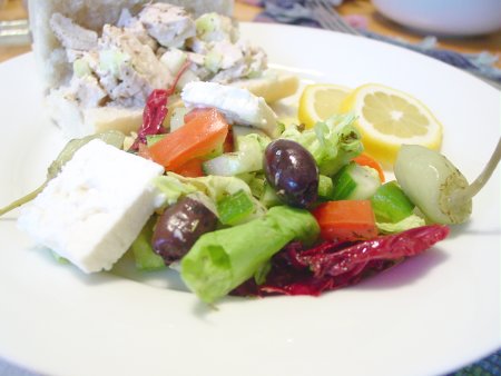 What Robin had planned was inspired, in part, by our many trips to the local diner. Many trips there have included a little (or a lot of) greek salad, which is something that we have yet to add to our cookbook. Tonight seemed like a good night for that addition. To accompany the greek salad, Robin planned a simple tuna salad sandwich – complete with lots of celery seed, of course.