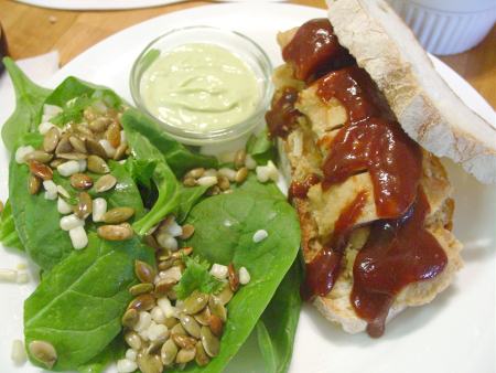 Chris stayed at work later than normal to make up the time, which meant dinner was later than usual. As a result, we tried to keep it simple. We finished up some chicken from Bubba’s, enjoying it on some fresh farmers’ market bread. We also had some fresh salad topped with corn niblets and pepitas. We whipped up some creamy dressing to boot. Very tasty.