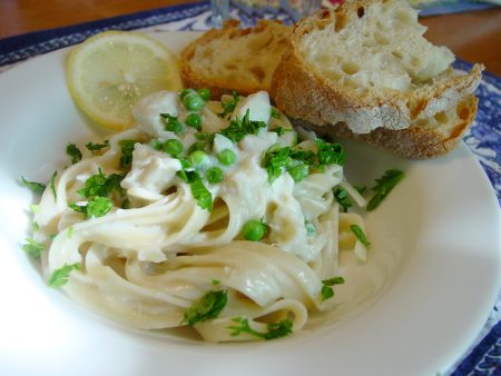 We opt to prepare a simple pasta dish with a crab sauce. Pasta is always welcome in our house—especially by our son. It also allows us to use up some more of the Farmers’ Market fresh bread. Always adverse to waste, we are quite happy using two items on hand—especially when the result is so tasty.
