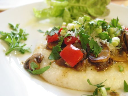 When the grits are thick and tender, we stir in about 1/2 cup of the Asiago cheese. We serve the grits with the pot roast, vegetables, the rest of the Asiago cheese, scallions and parsley on top.