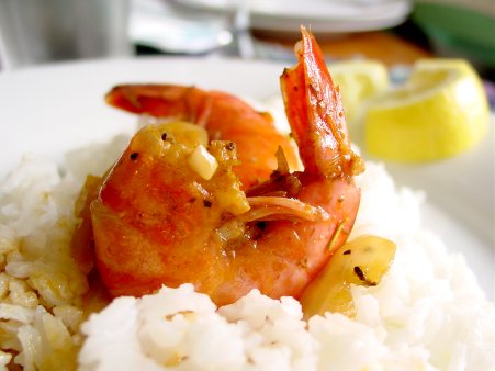 This recipe is adapted from “Moosewood Restaurant Cooks at Home”. It falls into the category of easy to prepare yet very elegant in presentation and taste. The cajun flavor really comes through in this recipe. The shrimp are served with their shells over cooked white rice so don’t forget lots of napkins!