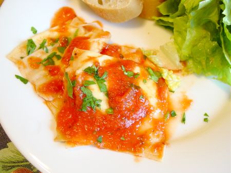 We add the ravioli and a pinch of salt to the boiling water and stir. We lower the heat slightly so the water is more like simmering with the ravioli. While the ravioli are cooking, we reheat our tomato sauce in a large pan. We cook the ravioli for 6 minutes and taste. We want the pasta tender and the filling cooked through. When the pasta is cooked, about 6½ minutes, we drain it using our “spider”, a chinese strainer, a few at a time and gently put them into the sauce. We stir carefully and serve with extra Locatelli.