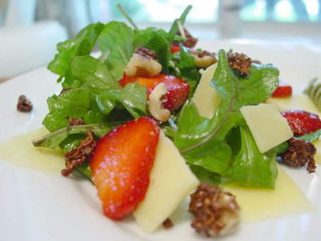 We are inspired by a spinach salad with strawberries and pecans at the Oregon Grille to combine arugula with strawberries and walnuts. The combination of the spiciness of the arugula, the sweetness of the local fresh strawberries and balsamic vinegar, and the crunchiness of the carmelized walnuts, is wonderful.