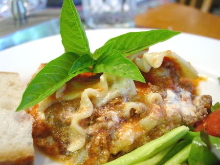 We remove the bubbling pan from the oven, cover loosely with the foil, and allow it to rest for 10 minutes. The lasagne is served with the additional hot tomato sauce and red pepper flakes.