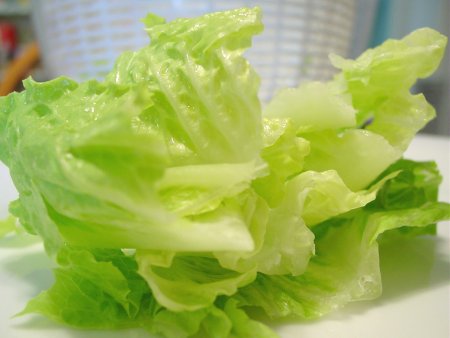 We tear the leaves into the colander, filling it only a third fill at most. With the colander inside of the salad spinner bowl, we fill the spinner with cold water, swishing the leaves around. We turn the water off and make sure that there are not any bugs (which would float to the top). If necessary, some of the water is poured out carefully, keeping the lettuce behind as the insects are removed. Then, we lift the colander with the lettuce out of the spinner and rinse the bowl. We fill the bowl with cold water and add the lettuce to it. We rinse the colander and then lift the lettuce from the bowl of water into the clean colander (over the sink so the water does not drip on the floor or counter). We check the water in the bowl and see if there is any dirt or sand. If so, we dump the water and repeat the process, filling the bowl with water and adding the lettuce. We continue until no dirt remains.