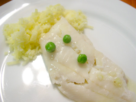 This is a simplified “fish en papillote”. We just use cooking spray instead of melted butter or oil since the children like to help with the spray. We do use the traditional parchment paper, but foil could be substituted. We do not add other ingredients to the packages since we want the ghosts to be white, but cooking fish in this way is only limited by one’s imagination. All the flavor remains in the package and the fish. As it bakes it creates its own sauce. It is unnecessary, but we add to our simple recipe with a quick orange and garlic butter sauce. Since it is a Halloween recipe, we decorate the fish with peas and riced potatoes for GHOSTS!