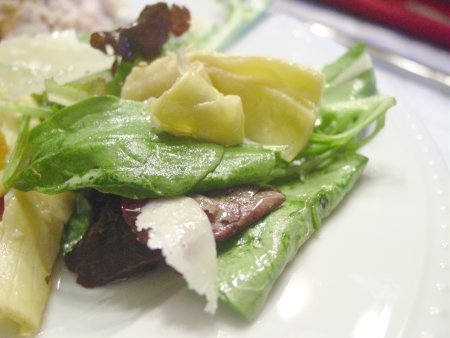 On a serving platter, we distribute the lettuces. We shake the dressing in the container and pour some of it over the greens. We toss with tongs and sprinkle with additional salt and pepper. We top with the artichoke hearts and use our peeler to add a generous amount of Parmigiano-reggiano. We pour on the rest of the dressing, discarding the garlic clove and serve.