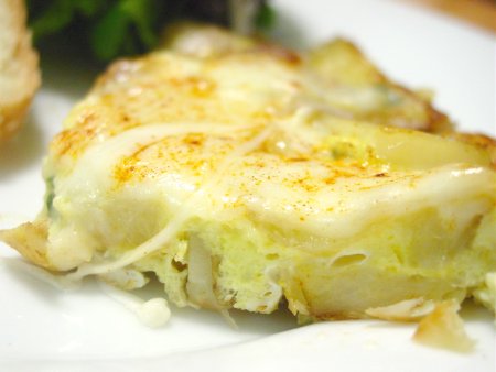 We vary the classic comfort dish from Robin’s childhood—"Potatoes and Eggs." We add onions and make a pizza-like frittata covered in mozzarella cheese. It is made with simple pantry staples and, when combined with a salad, it can be part of an elegant dinner.