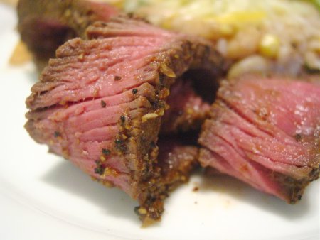 We transfer the meat with tongs to a foil covered cookie sheet. The meat is getting dark quickly from the sugar in the rub and infusing the air with the wonderful spicy fumes (we open the windows!) so we finish cooking the steak in the broiler for another couple of minutes on each side.